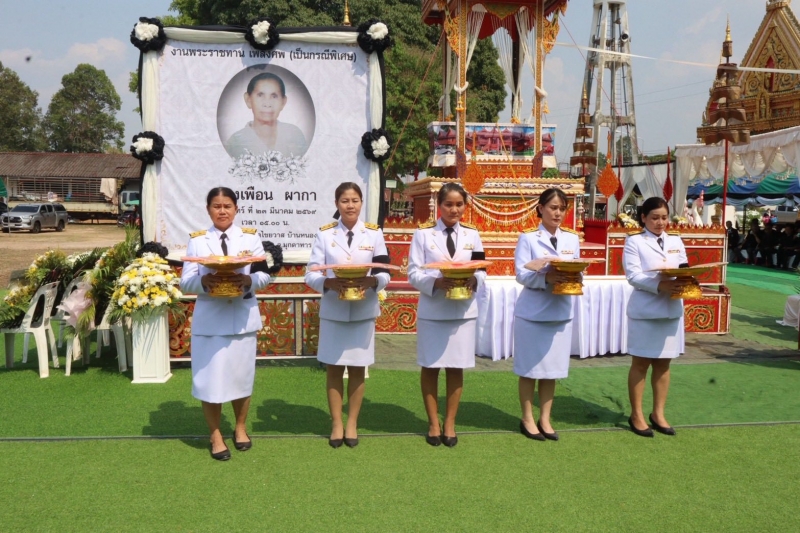 วันจันทร์ ที่ ๒๓ มีนาคม ๒๕๖๙ เวลา ๑๒.๐๕ น. นายวรญาณ บุญณราช ผู้ว่าราชการจังหวัดมุกดาหาร เป็นประธานในพิธีพระราชทานเพลิงศพ คุณแม่เพือน ผากา (เป็นกรณีพิเศษ) คุณแม่เพือน ผากา สิริอายุ ๘๓ ปี ๖ เดือน เป็นโยมมารดาของ พระศรีวชิโรภาส (เตชินท์ สิทฺธาภิภู ป.ธ.๙,ดร.) ผู้ช่วยเจ้าอาวาสวัดมหาธาตุยุวราชรังสฤษฎิ์ เลขานุการแผนกบาลีมหาธาตุวิทยาลัย สำนักเรียนวัดมหาธาตุ โดยภายในพิธีได้รับเมตตาธรรมจากคณะสงฆ์ทรงสมณศักดิ์ และพระเถรานุเถระชั้นผู้ใหญ่ อาทิ เจ้าคณะภาค ๑๐ และกรรมการมหาเถรสมาคม เข้าร่วมพิจารณาผ้าบังสุกุล ในการนี้ นายวรญาณ บุญณราช ผู้ว่าราชการจังหวัดมุกดาหาร ได้ประกอบพิธีอัญเชิญไฟพระราชทานและทอดผ้าไตรบังสุกุลหน้าเมรุ เพื่อเป็นการให้เกียรติและไว้อาลัยแก่ผู้วายชนม์เป็นครั้งสุดท้าย โดยมีนายสรสินธุ์ ดีดวงพันธ์ นายกเทศมนตรีตำบลดงเย็น พร้อมด้วยคณะผู้บริหาร สมาชิกสภาเทศบาล ปลัดเทศบาล หัวหน้าส่วนราชการ พนักงานเจ้าหน้าที่เทศบาลตำบลดงเย็น และประชาชนเข้าร่วมพิธีด้วยความสงบและสมเกียรติ ณ ฌาปนสถาน วัดไชยวาส บ้านหนองแคน ตำบลดงเย็น อำเภอเมืองมุกดาหาร